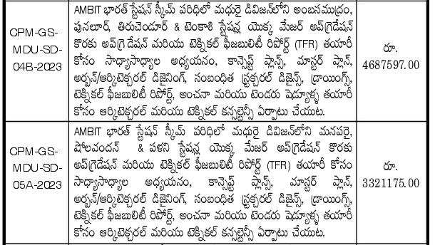 Tender For Major Updation of Manaparai, Sholavandan & Palani Stations in Madurai Division under AMBIT Bharat Station Scheme | Arrangement of architectural and technical consultancy for preparation of feasibility study, concept plans, master plan, urban/architectural designing, related structural designs, drawings, technical feasibility report, estimate and tender schedules for preparation of up gradation and Technical Feasibility Report (TFR).