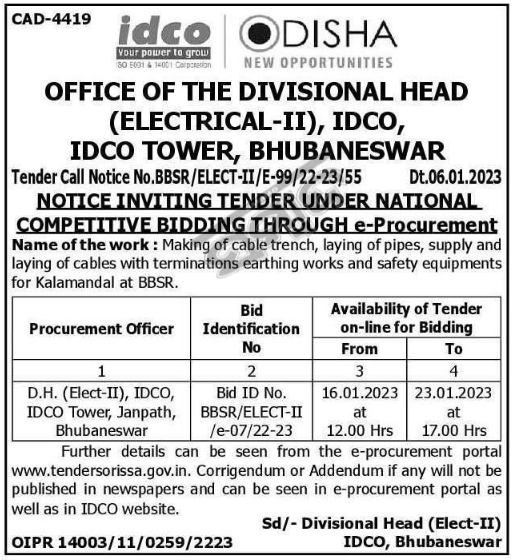 Tender for Making of cable trench, laying of pipes, supply and laying of cables with terminations earthing works and safety equipments for Kalamandal at BBSR.