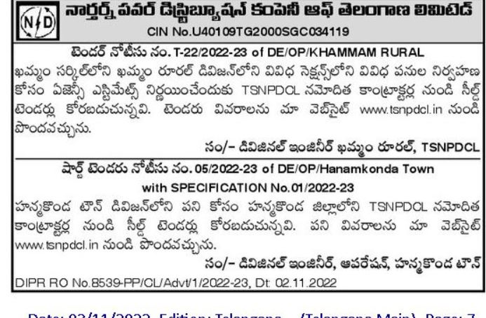 Tender For Management of various works in different sections of Khammam Rural Division in Khammam