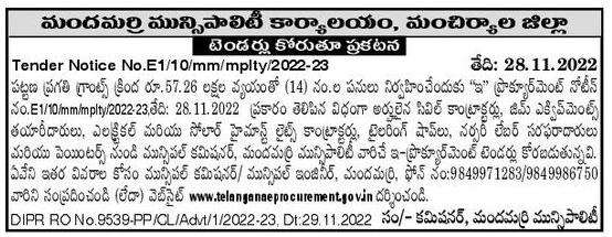 Tender for Mandamarri Municipality from gym equipment manufacturers, electrical and solar high mast lights contractors, tailoring shops, nursery labor suppliers and painters.
