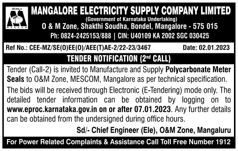 Tender For Manufacture and Supply Polycarbonate Meter Seals