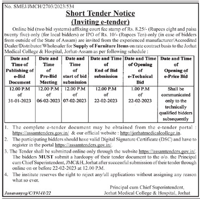 Tender for manufacturer/Accredited Dealer/Distributor/Wholesaler for Supply of Furniture Items on rate contract basis to the Jorhat Medical College & Hospital, Jorhat-Assam