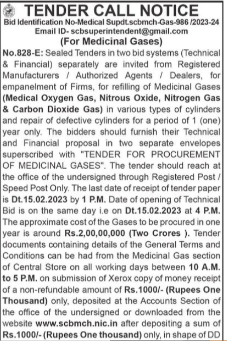Tender for Manufacturers / Authorized Agents / Dealers, for empanelment of Firms, for refilling of Medicinal Gases (Medical Oxygen Gas, Nitrous Oxide