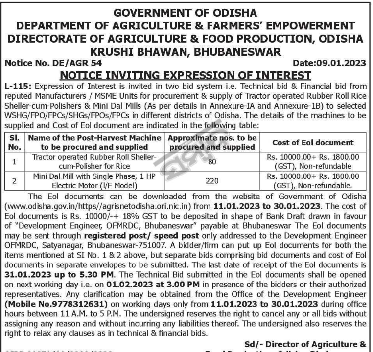 Sheller-cum-Polishers & Mini Dal Mills (As per details in Annexure-IA and Annexure-1B) to selected