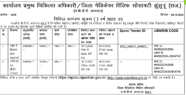 Tender for manufacturers/wholesalers/authorized dealers for supply and operation of Dharamshala and canteen in the following hospital Jhunjhunu.