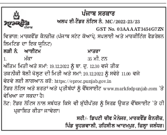 Tender for Markfed Canneries (Punjab State Coapro. Supply and Marketing Federation a unit of Ltd.)