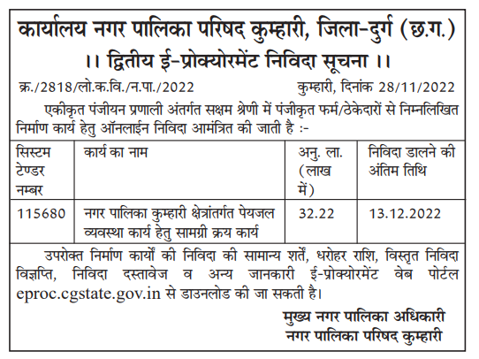 Tender for Material purchase work for drinking water system work under Municipality Kumhari area