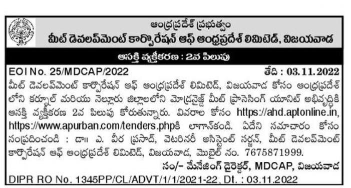 Tender for Meat Development Corporation of Andhra Pradesh Limited, Vijayawada | 2nd Call for Expression of Interest for Development of Modernized Meat Processing Unit in Kurnool and Nellore Districts.