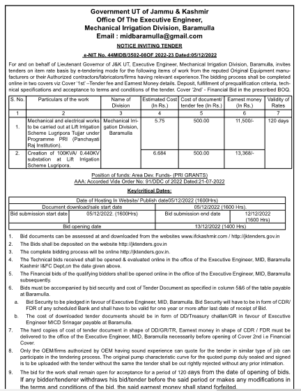 Tender for Mechanical and electrical works to be carried out at Lift Irrigation Scheme Lugripora Tujar under Program PRI (Panchayat Raj Institution).