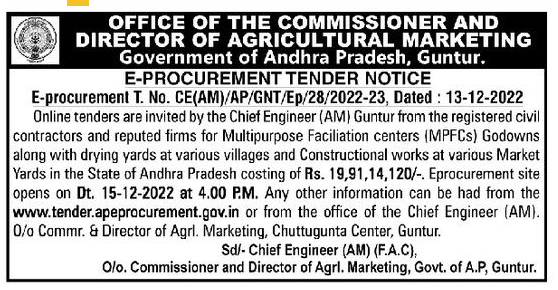 Tender for Multipurpose Faciliation centers (MPFCs) Godowns along with drying yards at various villages and Constructional works at various Market Yards in the State of Andhra Pradesh