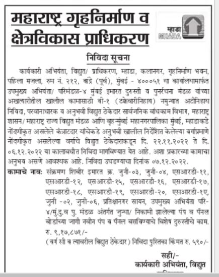 Tender For Mumbai Building Repairs and Reconstruction Board for the following work