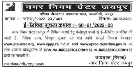 Tender for Municipal Corporation Greater Jaipur Pandit Deendayal Upadhyay Bhavan, Lalkothi, Jaipur are invited from registered firms for various works of Municipal Corporation Greater Jaipur