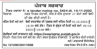 Tender for Municipal Corporation Mohali Department. e tender-notice no. 5424