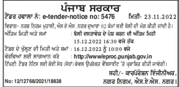 Department- Municipal Corporation Mohali, S.A.S. Bids are invited by the city for 02 works.