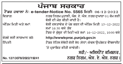 Tender for Municipal Corporation Mohali, S. A. S. For 01 work by Nagar Dept.