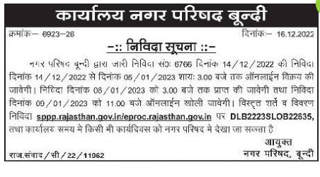 Tender for Municipal Council Bundi along with tender 6766 can be seen at sppp.rajasthan.gov.in/eproc.rajasthan.gov.in DLB2223SLOB22635, and on any working day in Municipal Council during office hours. Rule. dialogue / c / 22/11962 Commissioner Municipal Council, Bundi