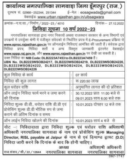 Tender for Municipality Sagwara Municipal bodies or other departments of Rajasthan Government and tender form tender condition and other detailed information internet website Online tenders are invited from the registered contractors in the above category in the undertakings through E-Procurement process on www.eproc.rajasthan.gov.in in the prescribed form. by sensor Can be seen at www.sppp.rai.gov.in and www.eproc.rajasthan.gov.in. The NIB Code of the said tender is: DLB222347453 to DLB222347459. UBN No. DLB2223WSOB24217, DLB2223WSOB24219, DLB2223WSOB24220, DLB2223WSOB24222, DLB2223WSOB24224, DLB2223WSOB24225, DLB2223WSOB24226