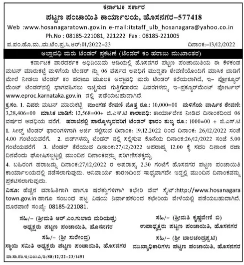 Tender for Mutton Market Store for a period of 06 years on monthly rent with advance deposit. Contractors who wish to participate in e-procurement tender can get the details on e-procurement portal www.eproc.karnataka.gov.in.
