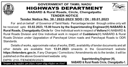 Superintending Engineer(H) NABARD & Rural Roads, Chengalpattu Circle for One Individual work in respect of Vellore (H) NABARD & Rural Roads Division