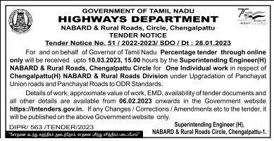 Tender for NABARD & Rural Roads, Chengalpattu Circle for One Individual work in respect of Chengalpattu(H) NABARD & Rural Roads Division under Upgradation of Panchayat