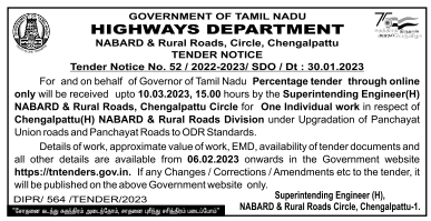 NABARD & Rural Roads, Chengalpattu Circle for One Individual work in respect of Chengalpattu(H) NABARD & Rural Roads Division under Upgradation of Panchayat Union roads and Panchayat Roads to ODR Standards.