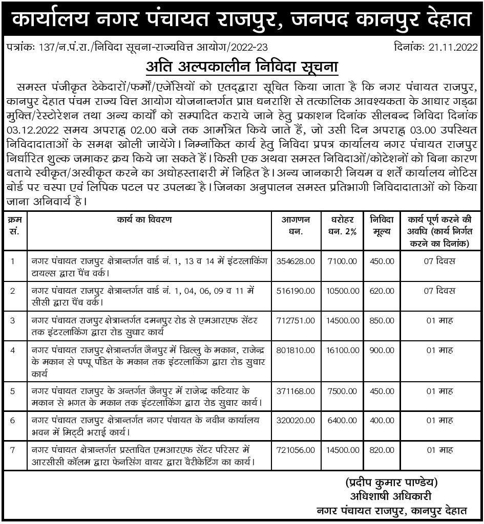 Tender for Nagar Panchayat Rajpur area under ward no. Patch work by CC in 1, 04, 06, 09 and