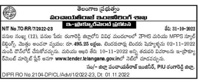 Tender for Name of Works: ZPHS and MPPS School Buildings in various Mandals of Rangareddy District.