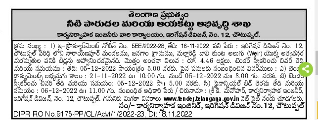 Narayanapur Mandal, Janagam Village, Choutuppal Range, Mallareddy Bavi Kunta Alugu (Weir) is inviting bids for urgent repair work.