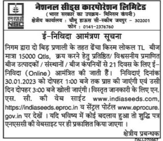 Tender for National Seeds Corporation Limited A Government of India Undertaking Miniratna Company) Regional Office Chowmu House C-Scheme Jaipur