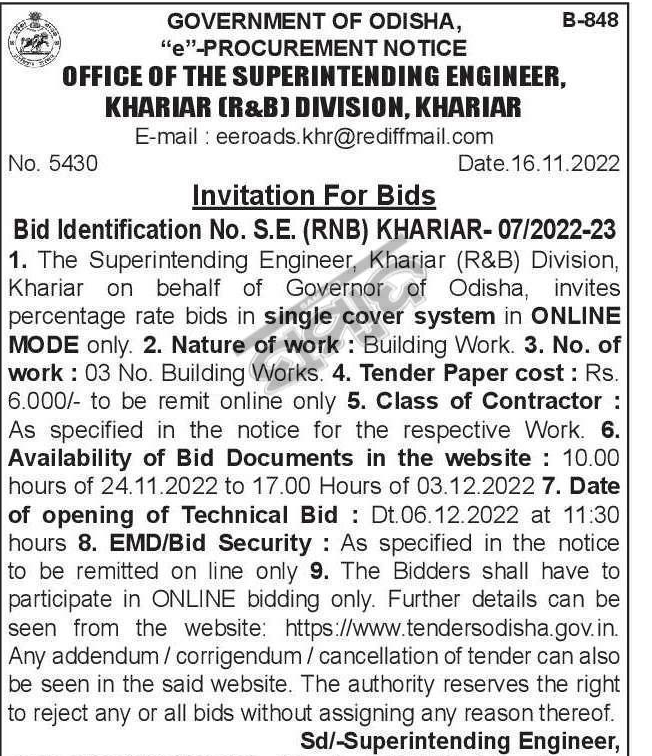Tender for Nature of work: Building Work. 3. No. of work: 03 No. Building Works. 4. Tender Paper cost: Rs. 6.000/- to be remit online only 5. Class of Contractor :