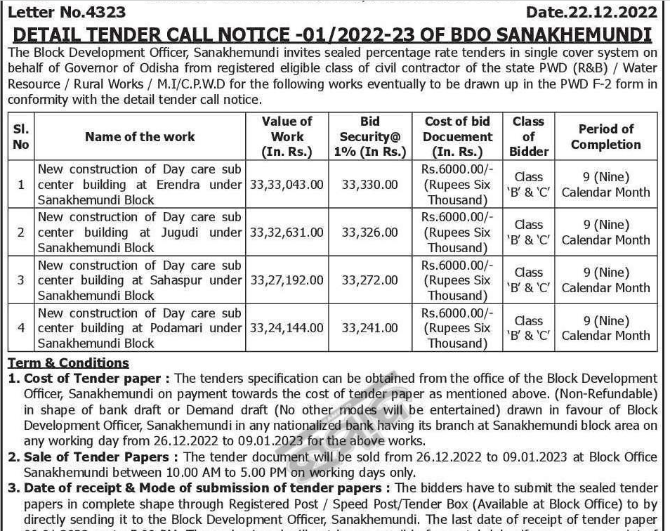 Tender for New construction of Day care sub center building at Jugudi under Sanakhemundi Block