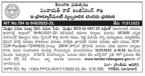 NHM-2021-22- Construction of Sub Center Buildings and MOMB – High Replacement of dilapidated rooms in schools with new classrooms, major and minor repairs, electrification, dining halls and drinking water supply to schools and halls and other works, SDF- The undersigned invites tenders for CDP-Ruraban-TSWREIS Grants- 2BHK Housing Program and construction of various buildings.