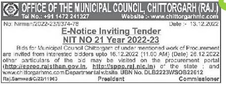 Tender for NIT NO 21 Year 2022-23 Bids for Municipal Council Chittorgarn of under mentioned work of Procurement are invited from interested bidders