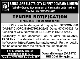 Tender for No. BESCOM/GM (DAS&TIC)/OFC/BMAZ/2022-23/43 Date: 07-03-2023 for Leasing of OFC Network of BESCOM in BMAZ Area.