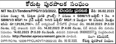 Tender for No. of Works: 18, (Urban Development Grants: 7 Works + SBM/1/3 Budget: 1 No. + SBM/1/3 MGF: 1+ Green Budget: 1+1/3 Budget/ MGF: 9 Total= 18 Works ).