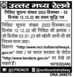 Tender for North Central Railway First corrigendum of Tender Notice No. 2022 December 02 dated 12.12.22 Tender Notice No. 2022 December-02 dated 12.12.22 against serial number 1 of the tender which was to be opened on 03.01.23 be considered as cancelled. Details http://www.ncr.indianrailways. gov.in and/or the Government of India portal can be seen at http://www.tenders.gov.in