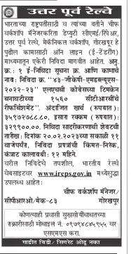Tender for North Eastern Railway invites Deputy CME/Repair, North Eastern Railway, Mechanical Workshop, Gorakhpur for the President of India and on his behalf Chief Workshop Manager