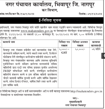 Tender for Numbering all properties within Bhiwapur Nagar Panchayat limits, surveying properties, preparing their maps, taking digital photographs, collecting computerized tax information, reviewing properties and facilities available in Bhiwapur Nagar Panchayat Data entry of technical information of surveyed properties provided by Municipal Council Administration |IWBP In software, compilation of computerized assessment information and other technical information to database Annual overhaul of connecting work and annual maintenance