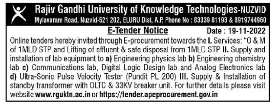 “O & M of 1MLD STP and Lifting of effluent & safe disposal from 1MLD STP II. Supply and installation of lab equipment to a) Engineering physics lab b) Engineering chemistry lab c) Communications lab, Digital Logic Design lab and Analog Electronics lab d) Ultra-Sonic Pulse Velocity Tester (Pundit PL 200) III. Supply & Installation of standby transformer with OLTC & 33KV breaker unit.