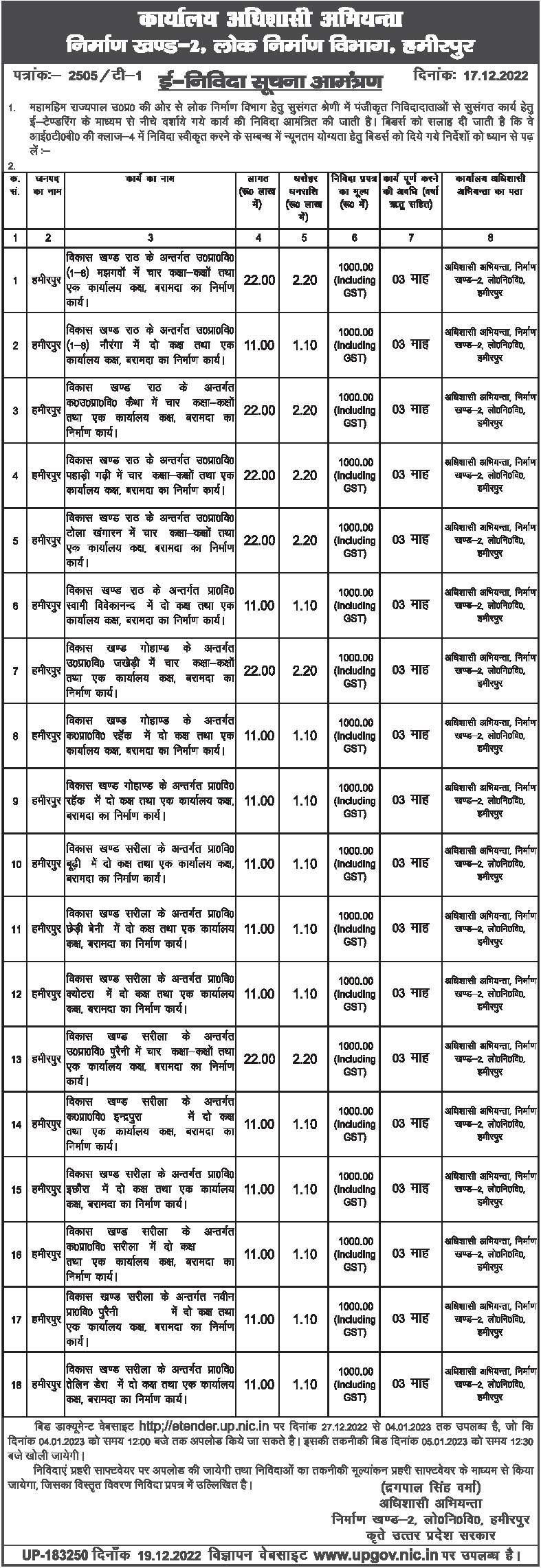 Tender for of four classrooms, one office room, verandah in development block Gohand U.P.V. Jakhedi under Gohand.