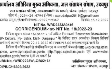 Tender for Office of Additional Chief Engineer, Water Resources Division, Udaipur Water Resources Complex, Opposite Aakashvani, Chetak Circle, Udaipur CORRECTION-1st- NIT No. 18/2022-23 The tender notice number 18/2022-23 mentioned in the following work Beneshwar Dharan Anicut, BP Dolpura PS Sabia, Distt. Dungarpur tender form upload sales