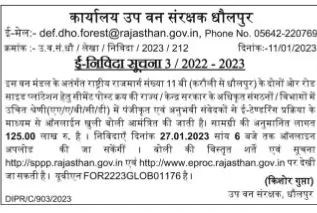 Tender for Office of Deputy Conservator of Forests Dholpur National Highway No. 11V under this Forest Division (for road site plantation on both sides of Karauli to Dhaulpur), registered in proper category (AA/A/B/G/D) in authorized organizations/departments of state central government for purchase of cement post and Online open bids are invited from experienced contractors through e-tendering process.