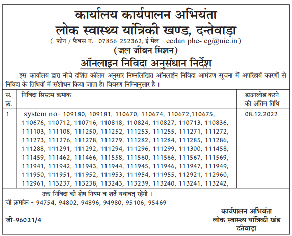 Tender for Office of Executive Engineer Public Health Engineering Block, Dantewada