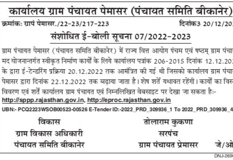 Tender for Office of Gram Panchayat Pemasar (Panchayat Samiti Bikaner) Number: Grappen Paymaser. / 22-23/217-223 see 3 20/12/20: