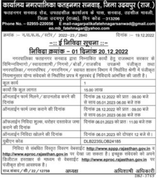 Tender for Office of Municipality Fatehnagar Sanwad, District Udaipur (Raj.) Fatehnagar Sanwad Road, Near Sub Tehsil Office, Sanwad, Tehsil Mavli, District Udaipur Municipality Fatehnagar Sanwad, Government of Rajasthan,