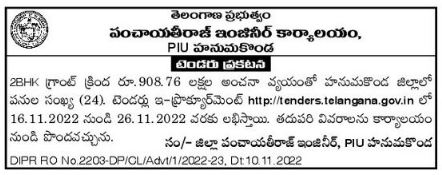 Tender for Office of Panchayat Raj Engineer, PIU Hanumakonda.