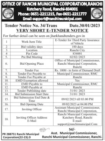Tender for OFFICE OF RANCHI MUNICIPAL CORPORATION,RANCHI Ranchi Municipal Corporation, Ranchi Municipal Corporation, Kutchery Road, Ranchi