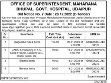 Tender for OFFICE OF SUPERINTENDENT, MAHARANA BHUPAL, GOVT. HOSPITAL, UDAIPUR Diagnostic Kits & Items