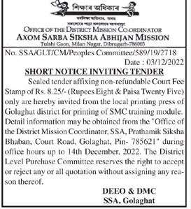 Tender for OFFICE OF THE DISTRICT MISSION CO-ORDINATOR AXOM SARBA SIKSHA ABHIJAN MISSION Tulshi Gaon, Milan Nagar Sealed tender affixing non-refundable Court Fee