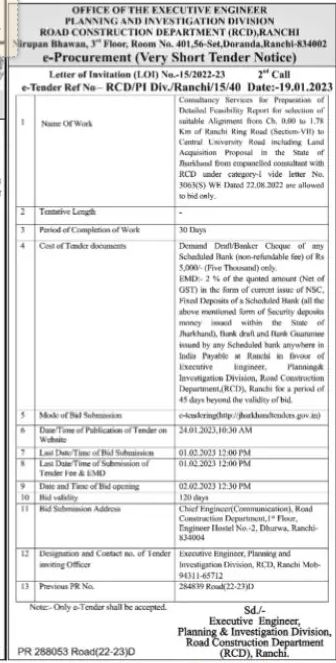 Deal Femibility Report for selection of suitable Aligiment from Ch, 0.00 to 1.78 Kim of Ranchi Ring Road (Section VII) Central Leverity Road including Land Acquisition Proposal in the State of Turkhand bom empanelled nomultant with RCD under category- vide letter No. 3063S) WH Dated 22.08.2022 are allowed to bid only